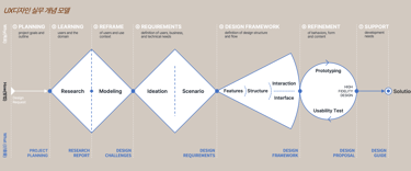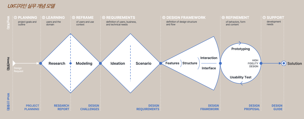 중요한 점은 디자인 프로세스 모델이 보다 구체적으로 디자이너가 무엇을 위해서 어떤 것을 실행하고, 어떤 산출물을 만들어 내야 하는지를 명확하게 나타내는 개념 모델이 되어야 한다는 것입니다. UX 디자인을 아무리 간단히 이해한다고 하더라도, 클라이언트나 자체적인 의도를 이해하고 기획서를 만들고, 문제적 상황을 이해하기 위해서 배우고, 그것을 재구조화 하여 문제를 정의하며, 또 문제 해결을 위한 아이디어 발상과 시나리오를 통해 요구되는 것을 파악하고, 그것을 디자인 프레임워크로 구성하는 과정을 거쳐, 실질적인 디자인 안으로 만들고, 그 안을 실험하며 계속해서 반복적으로 개선하고, 개선한 결과를 최종안으로 만들고, 마지막으로 필요한 형태와 방식으로 전달하는 과정으로 구분하는 것이 보편적인 디자인 실무 상황에 가깝다고 할 수 있다. 이것은 최소 7단계로 이루어진다.