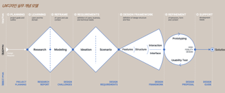 그리고 문제와 해결 다이아몬드 전후방에 각각, '방향과 비전 설정(Orientation and Vision Setting)', '여정 지속하기(Continuing the Journey)'를 배치하여, 이 두 개념을 구체적인 문제해결 절차에 포함시켰습니다. 또 문제해결과정의 상위는 연결과 관계 맺기(Connections and Relationships)를, 하위는 리더십과 스토리텔링(Leadership and Storytelling )을 배치하여, 디자인 과정에서 여러 이해관계자와의 연대와 문제해결을 위한 설득이 중요하다는 점을 강조하였다고 생각합니다.
